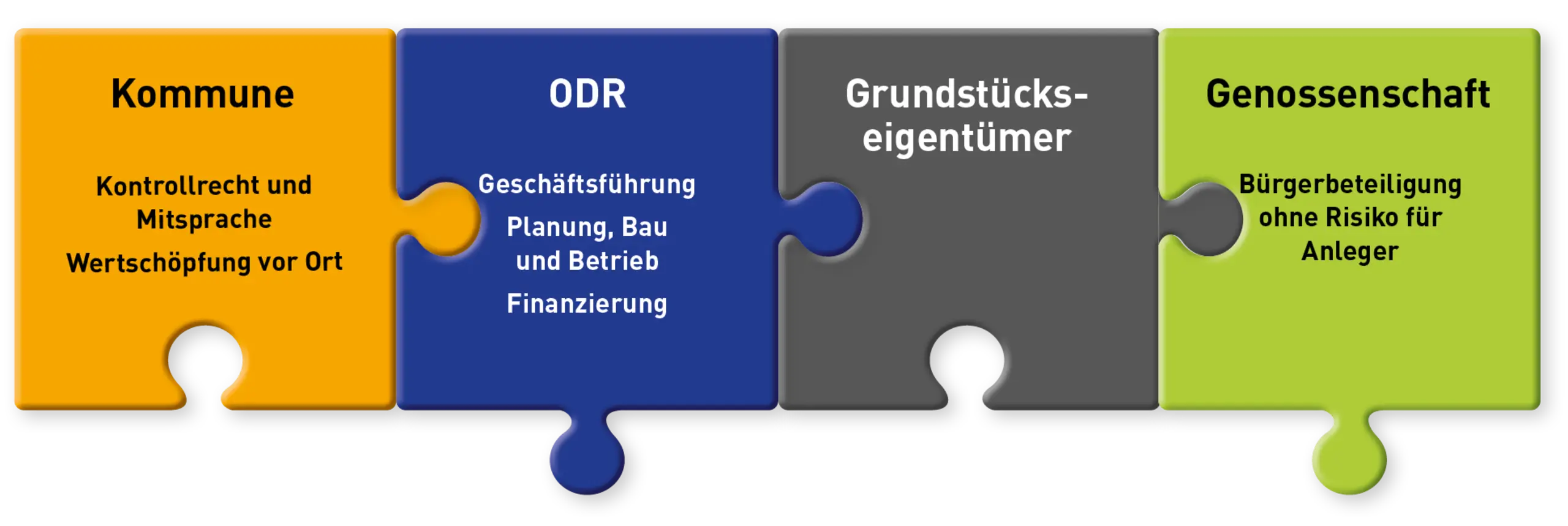 Bürgerinnen und Bürger können sich mittels einer Bürgergenossenschaft an einzelnen Anlagen beteiligen. Das Risiko verbleibt bei der ODR, die die Mehrheit der Anteile hält und im Gegenzug Finanzierung, Geschäftsführung sowie Planung, Bau und Betrieb der Anlage übernimmt.